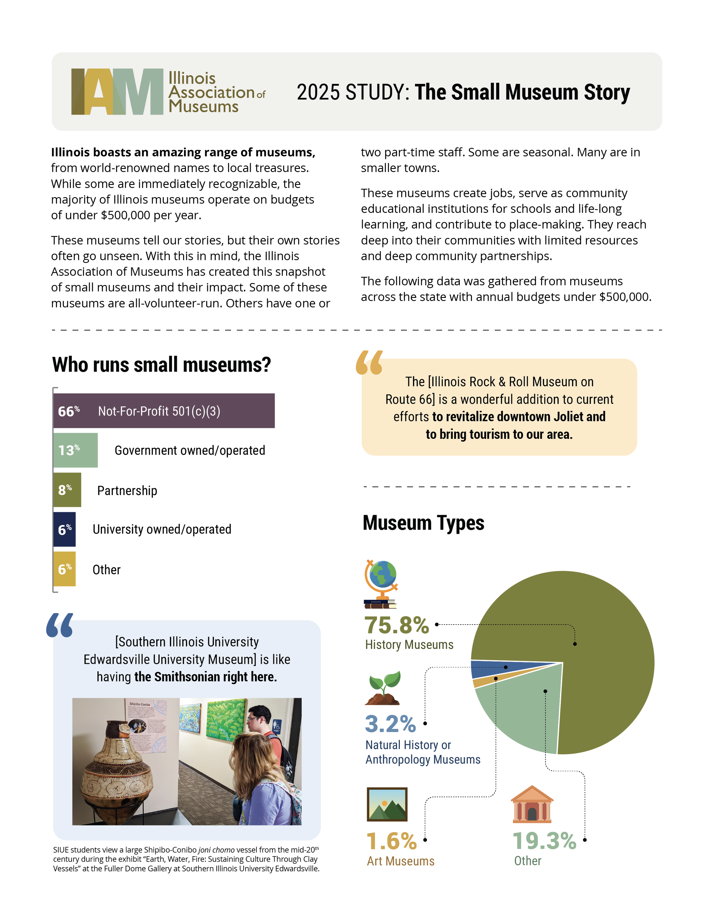 The Small Museums impact report for the Illinois Association of Museums was created to clearly communicate the value of small museums across the state and highlight their contributions to local communities. The final piece uses bold infographics, clean data visualization, and real photography to make key statistics easy to digest and engaging for readers. By presenting complex data in a visually compelling way, the report helped the organization tell a powerful story about the economic, educational, and cultural impact of Illinois museums, strengthening their case for continued funding, partnerships, and community support.