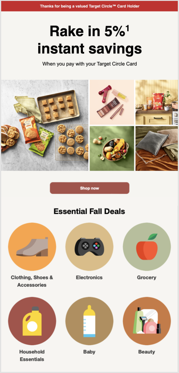 The purpose of this campaign is to highlight the benefits of the Target Circle Card by featuring the core value prop in alignment with the season. This email is deployed monthly, showcasing relevant imagery and products to entice the shopper.