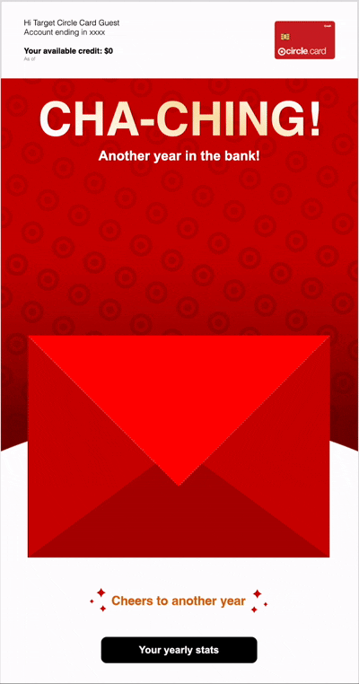 The purpose of this campaign is to celebrate cardholder's who have reached their yearly anniversary with the card and to reinforce the ongoing value of the Target Circle Card by highlighting the benefits and rewards they've enjoyed over the past year. This communication uses celebratory imagery and has a fun yet appreciative tone that acknowledges their loyalty and makes them feel valued.